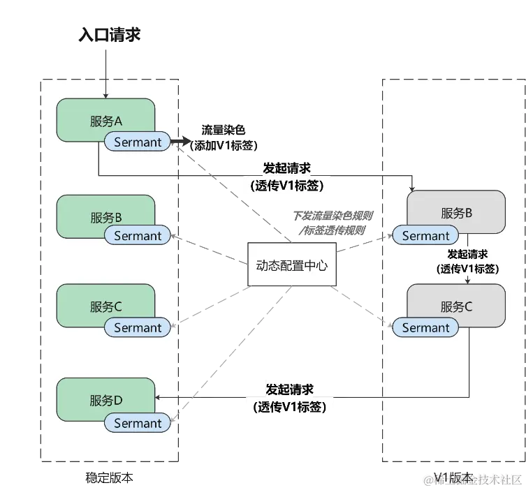 Sermant的流量染色、流量标签透传、标签路由能力使得Sermant具备了完整的全链灰度发布的能力。并且染色、透传、路由规则都支持动态配置,让全链灰度发布可以按照实际场景的需求来进行开关或调整治理规则。