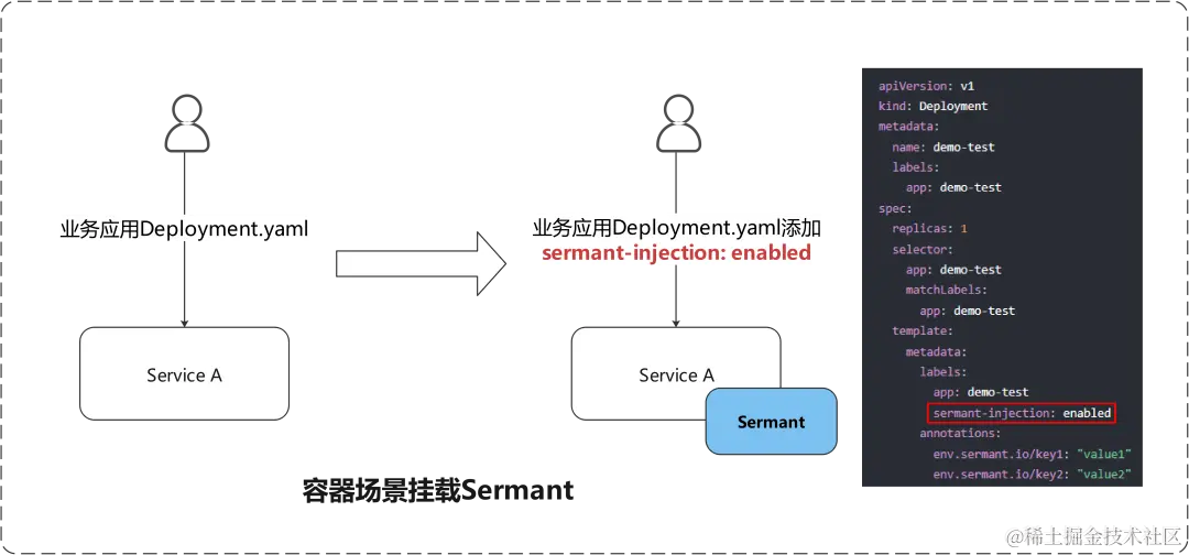 在容器场景,在部署了sermant-injector组件后,创建容器时只需在Deployment中添加一行sermant-injection:enabled的Label就能在创建Pod时让业务应用挂载Sermant启动,真正做到一键接入。