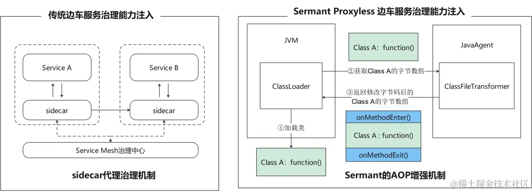 Sermant利用了Java的字节码增强能力,实现方式是面向AOP的服务治理能力注入。相对于Istio这种sidecar架构来说,无独立进程开销,性能提升明显。