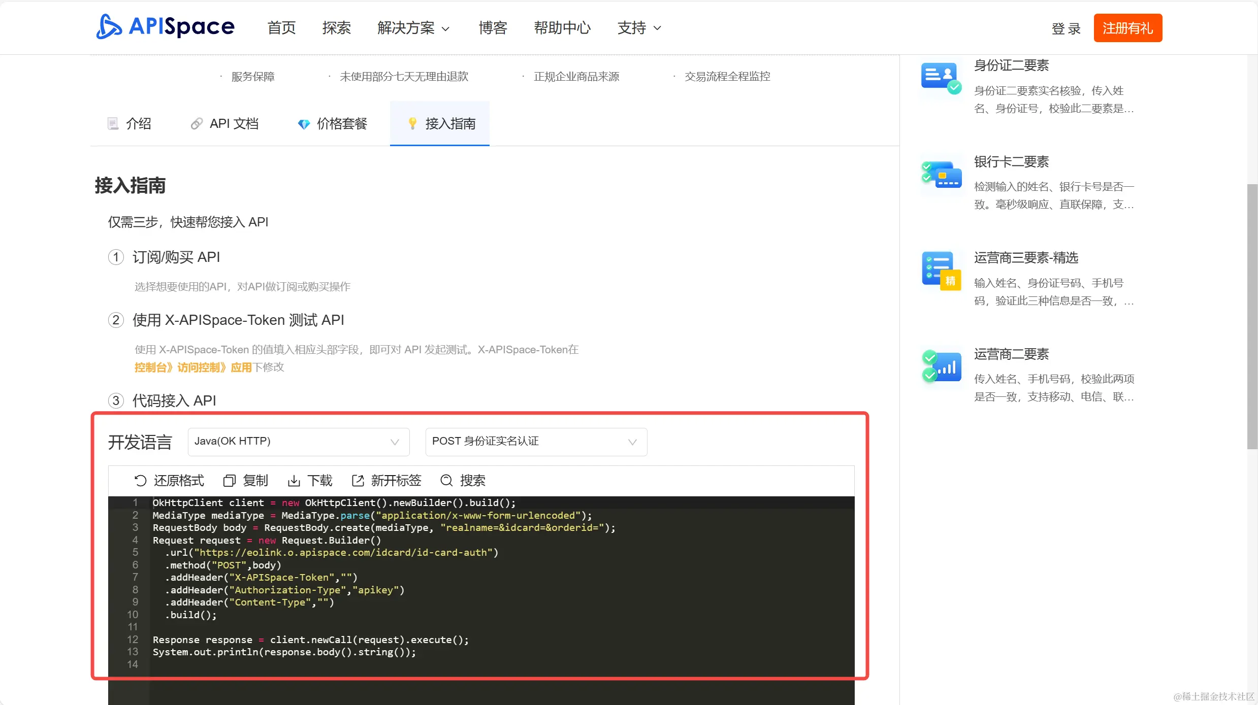 在【接入指南】我们可以看到提供了接入代码示例,可以帮助我们快速将API接入到自己的系统当中~