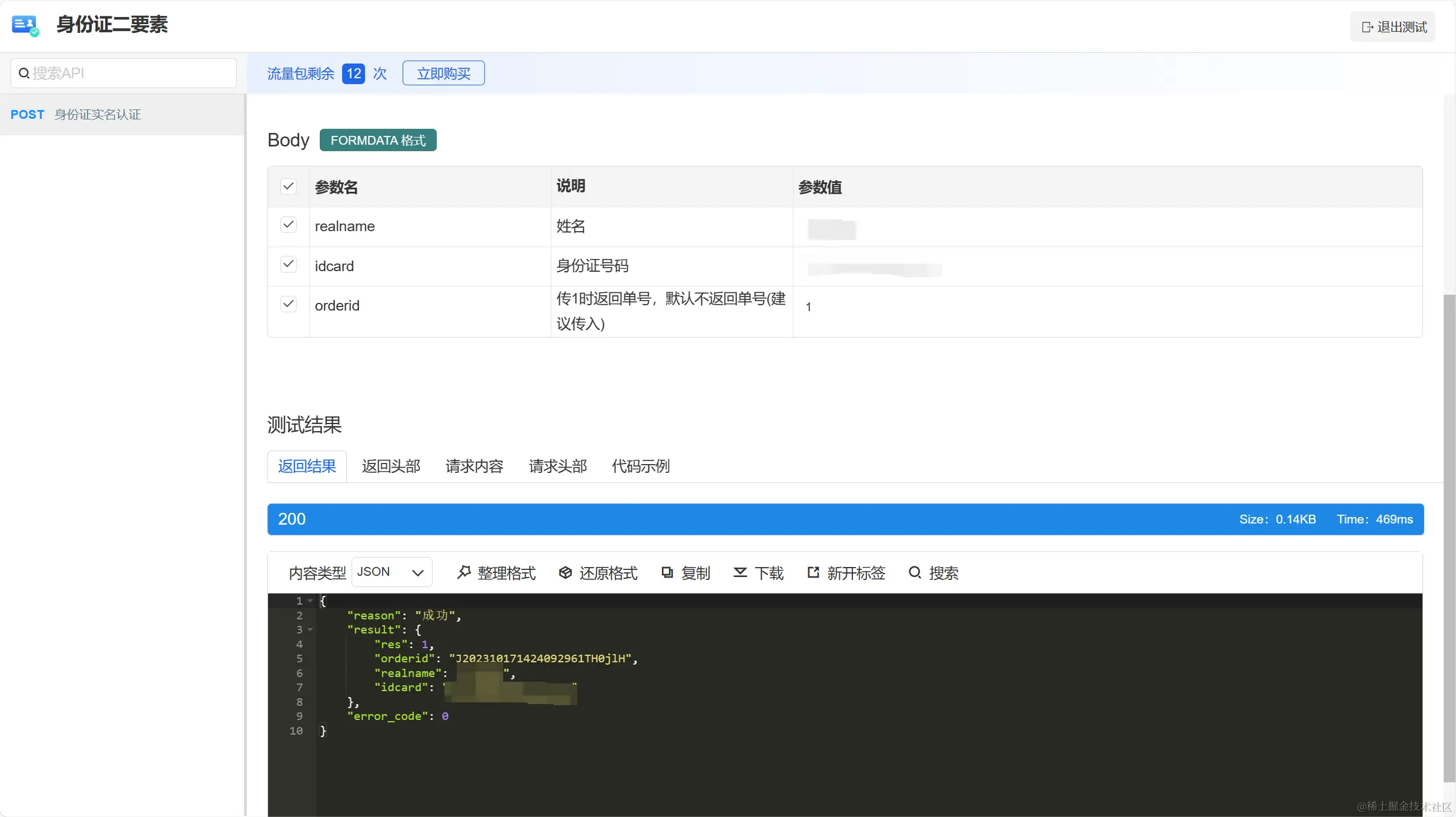 2.测试 身份证二要素API