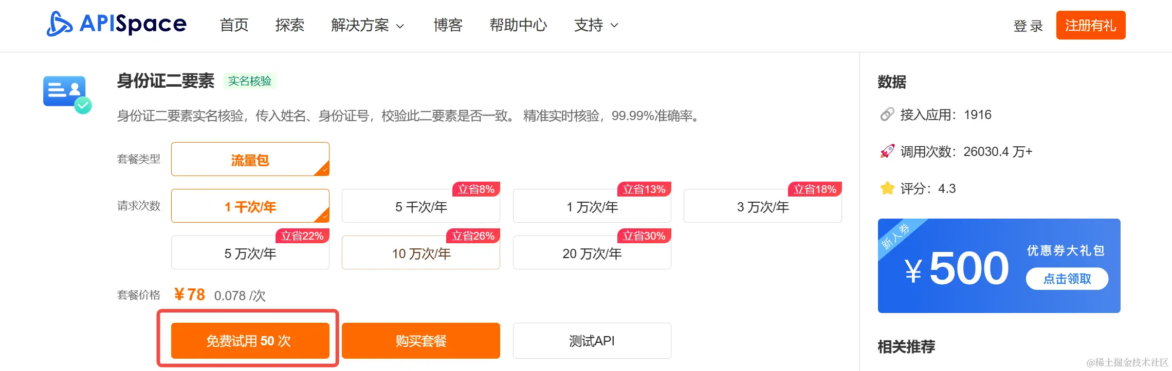 注册登录 APISpace,进入 身份证二要素详情页,领取接口调用次数。