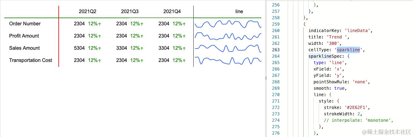 配置方式: 将其中某一个指标cellType设置为'sparkline',对于图表趋势可以使用icon进行配置