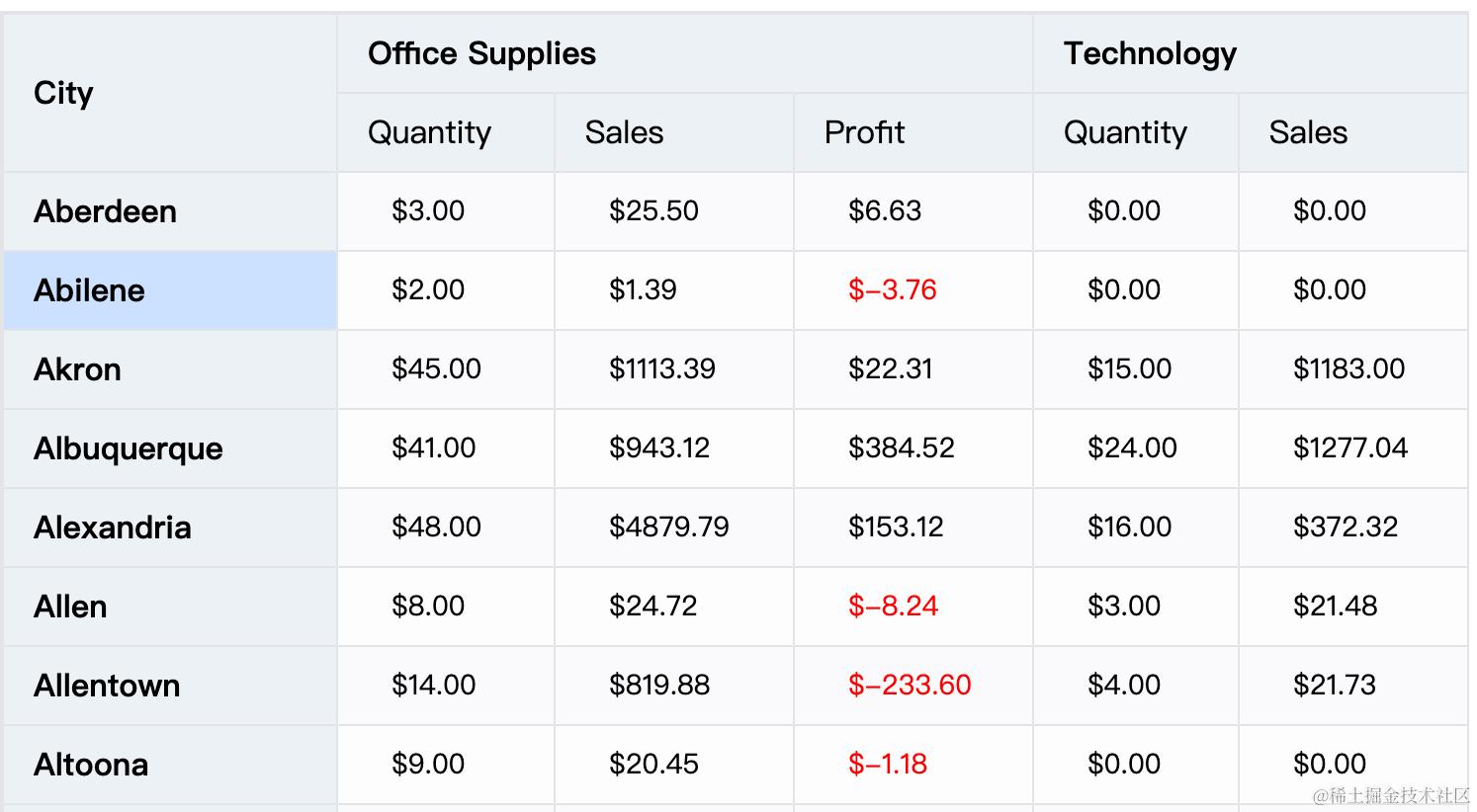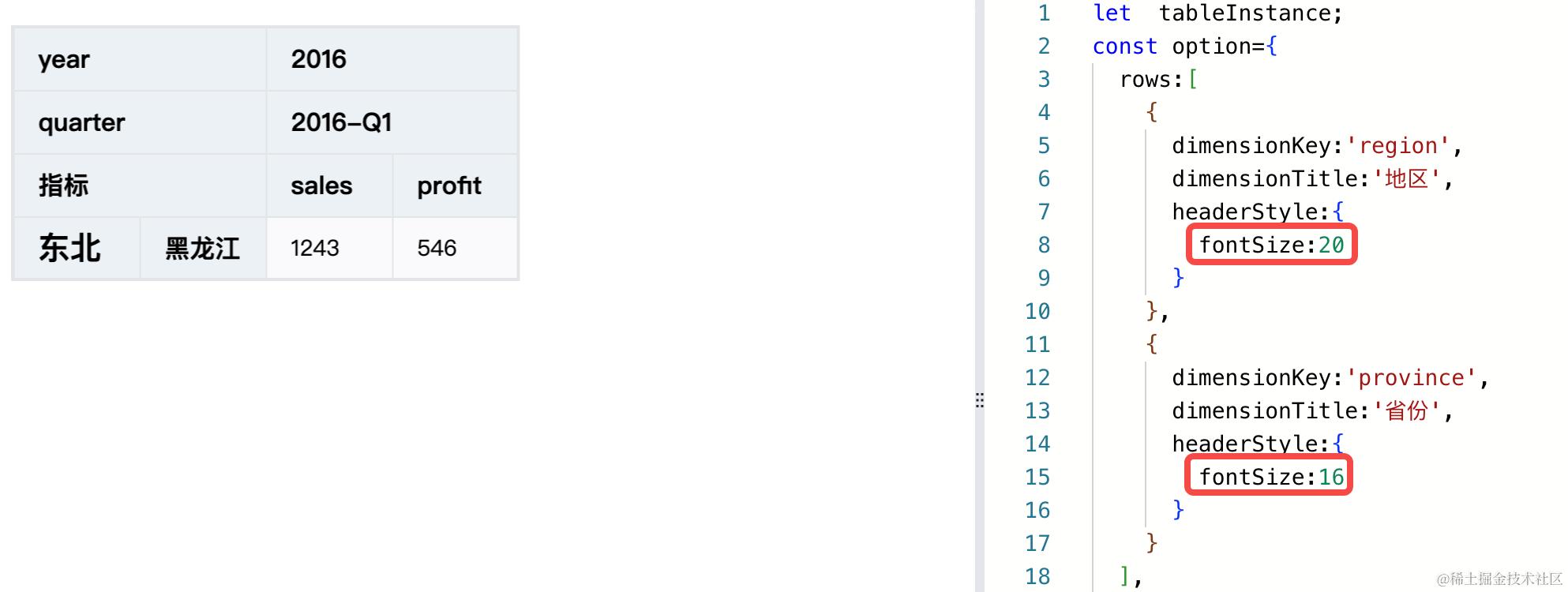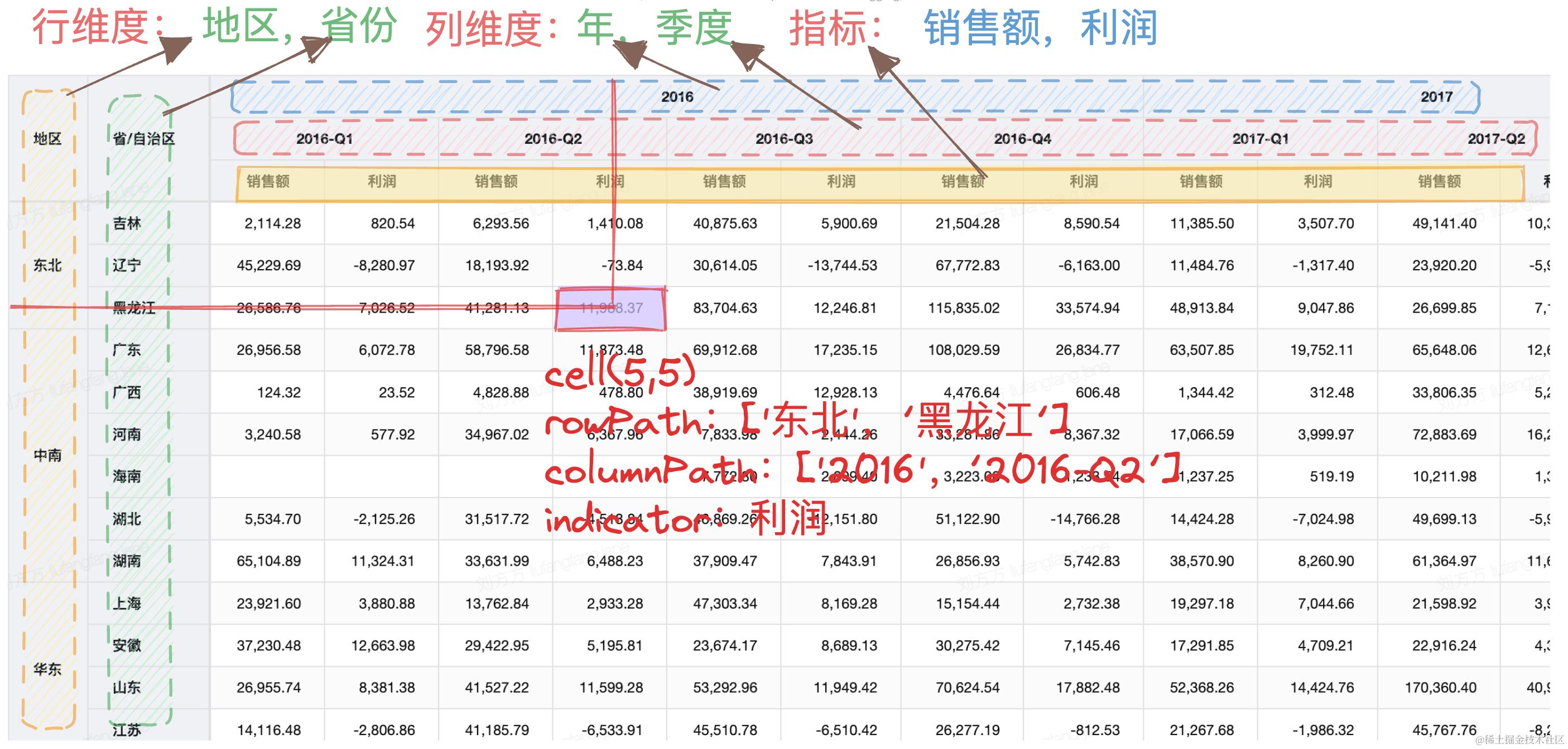 针对图中销售数据,位置在单元格[5, 5],即列5行5的数据:代表了2016年Q2季度下东北地区黑龙江省的销售利润值。也就是对应到行维度值:['东北', '黑龙江'],列维度:['2016', '2016-Q2'],指标:'利润'。接下来将介绍如何用VTable实现这种多维表格。