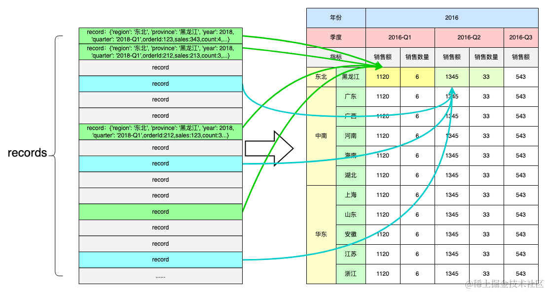 经过对record分组聚合的分析计算,最终呈现到表格中单元格数据和records数据源的对应关系: