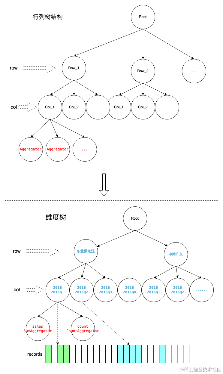 根据上述遍历的结构,将产生一棵维度树,从这棵树可以查找到单元格的值及值的原始数据条目。