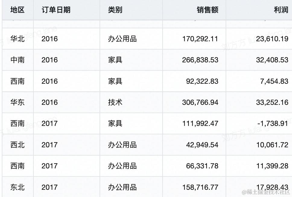 在对这样的表数据进行分析时,不同的数据分析师或者不同角色都会基于自己感兴趣的业务角度提出相关的问题,比如:有人关心各个地区的销售额,希望找出销售情况较低的地区;有人需要了解近期内不同产品类别的销售额对比,便于做后期的产品研发······