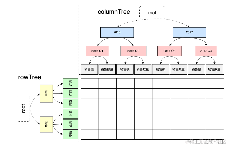 虽然具有分析能力的多维表格可以自动分析各个维度的维度值组成行列表头的树形结构,并且可以根据dataConfig.sortRules进行排序,但具有复杂业务逻辑的场景还是期望可以能够自定义行列表头维度值及其顺序。那么可以通过rowTree和columnTree来实现这些业务需求场景。