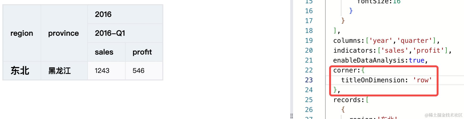 配置方式: 默认角头会显示列维度columns中的维度名,如果想以行维度的维度名显示在角头,配置titleOnDimension为row。