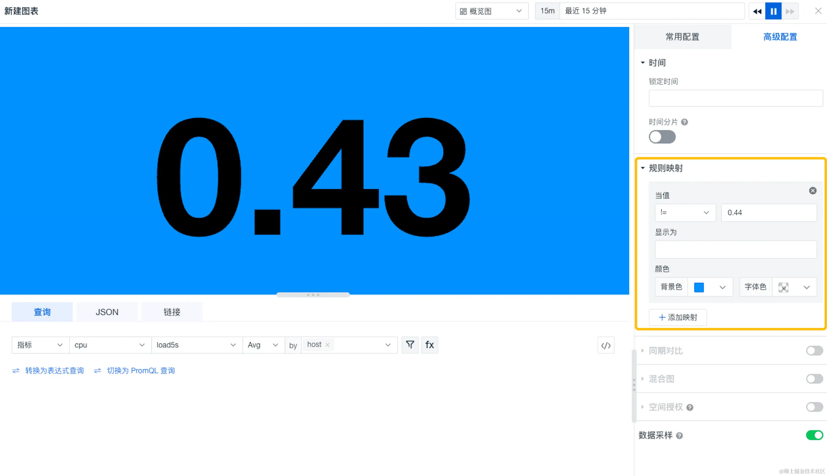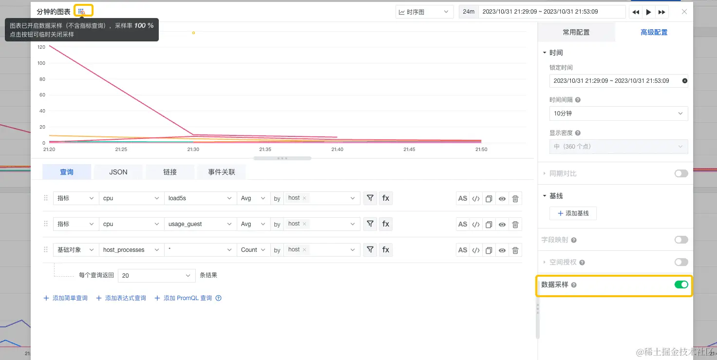 - 仪表板新增「数据采样」功能:针对Doris 日志数据引擎的工作空间,图表高级配置「数据采样」开关,默认为 「开启」 状态。图表上会显示「采样率按钮」及该图表当下的数据采样率;点击按钮可以临时「关闭/开启采样」,刷新页面状态重置。如需永久查询完整数据,可在图表高级配置中关闭「数据采样」功能。