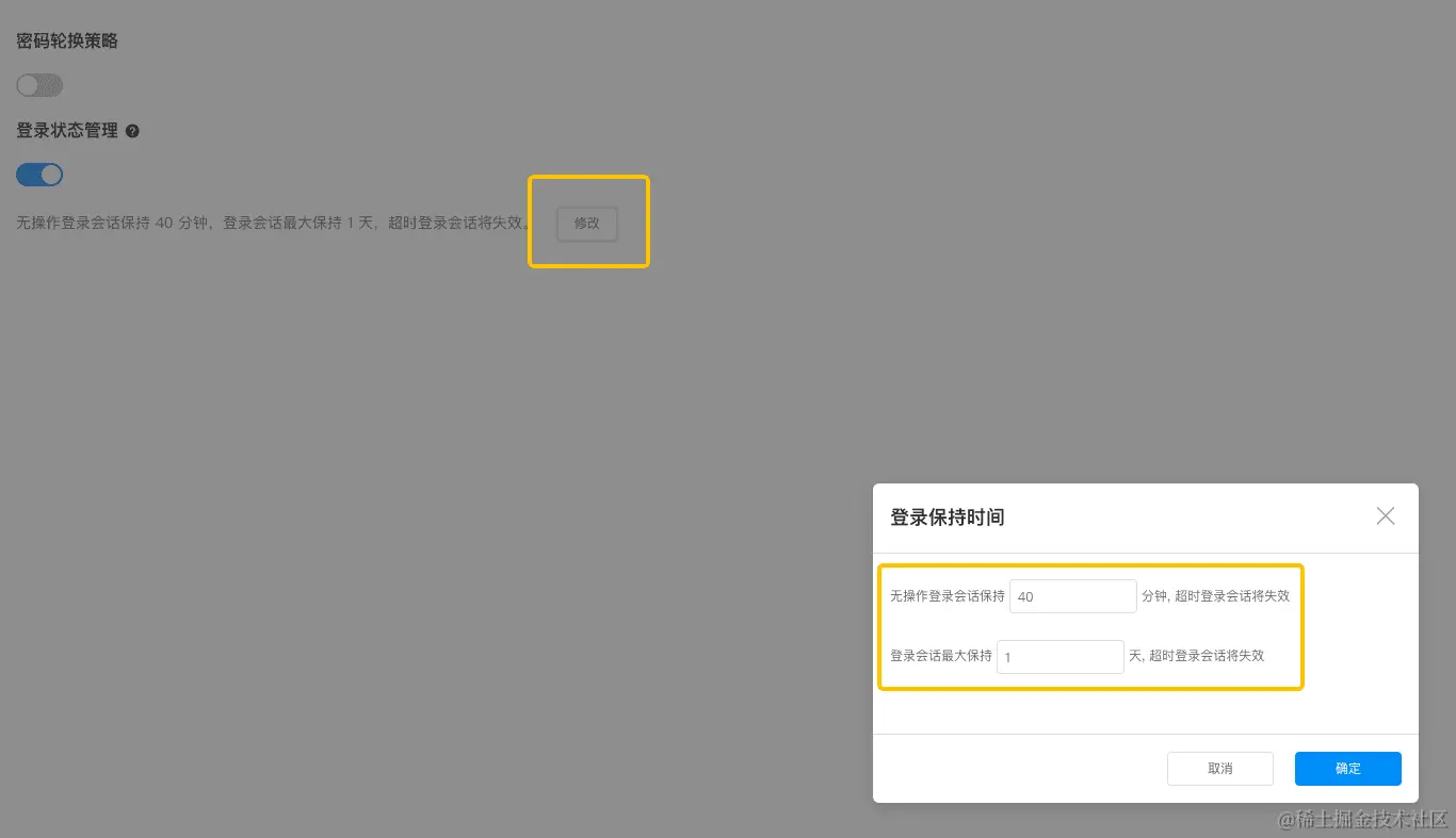 【新增账号会话失效时长自定义配置】:您可以在【管理后台】-【账号状态管理】自定义配置「无操作会话时间长度」和「最长会话失效时间」。