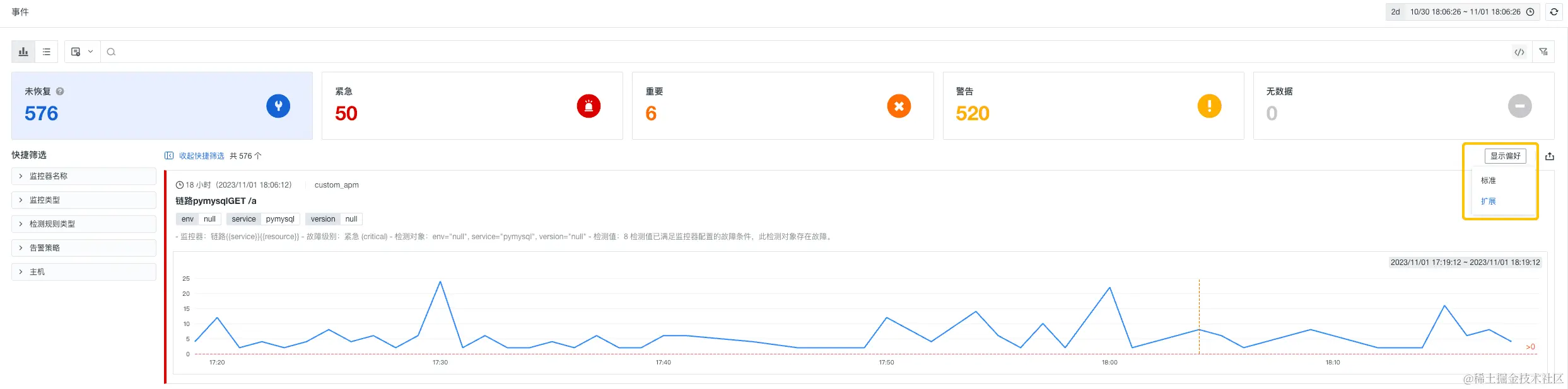 - 未恢复事件列表样式新增【显示偏好】,默认为「标准」;若选择「拓展」,则会在列表处显示「历史趋势」图表,也可以选择某数据点查看其他关联数据,快速实现数据联动查询分析。