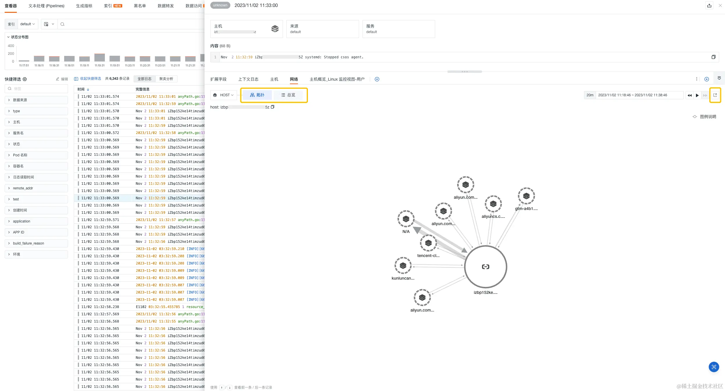- 其他查看器详情页的网络分析中,新增「拓扑」模式且默认展示,可直接查看当前对象的网络上下游关系以及一些网络关键指标,也可以切换到「总览」模式查看网络详情。同时支持点击按钮一键跳转到网络查看器进行网络数据分析。