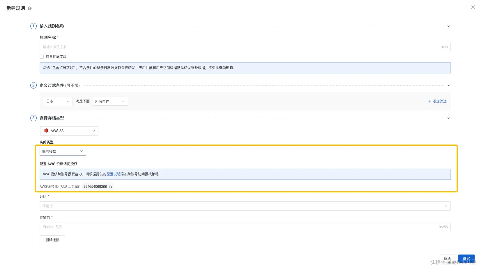 - 数据转发规则中 AWS S3 、阿里云 OSS 新增支持 「跨账号授权」 配置,快速实现授权配置,提高工作效率。