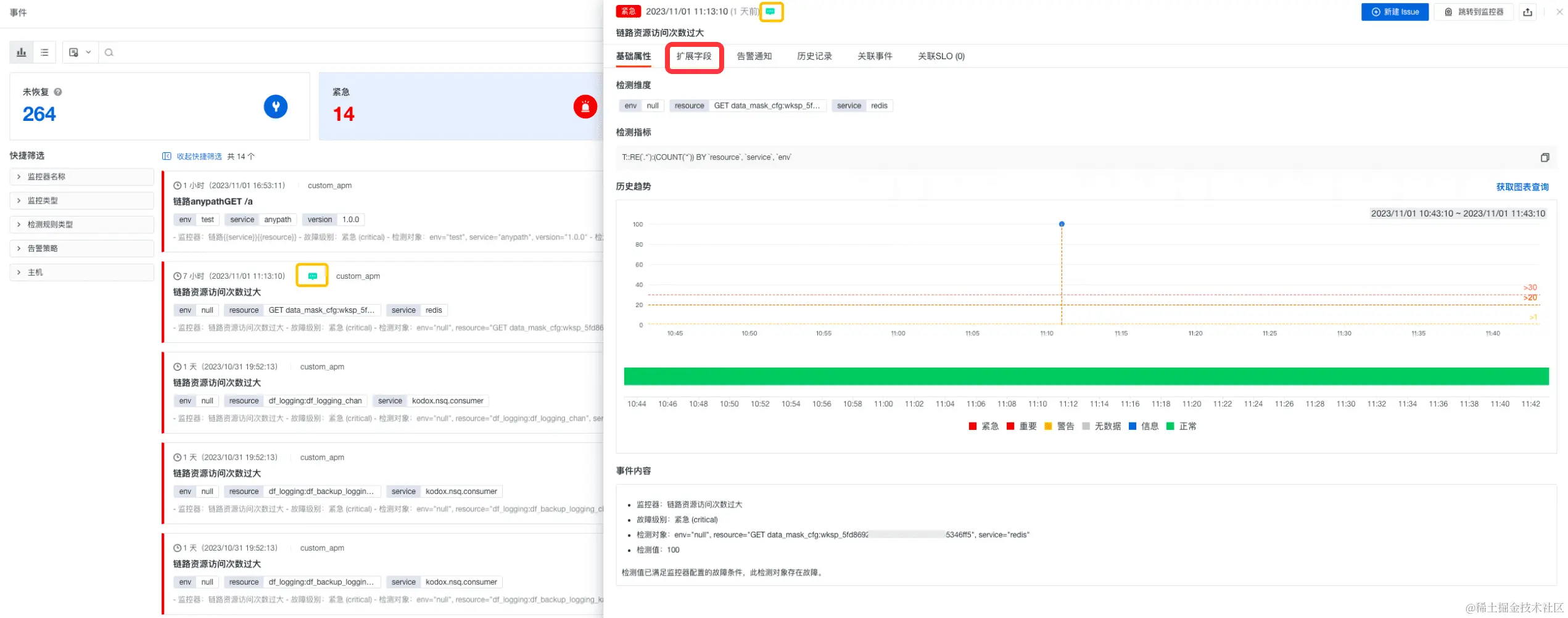 - 事件详情页新增「扩展字段」,便于及时查看该事件所有相关字段信息。也可以直接在事件列表和详情页的顶端看到该事件的告警通知对象。