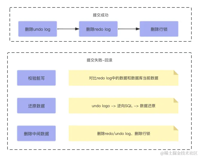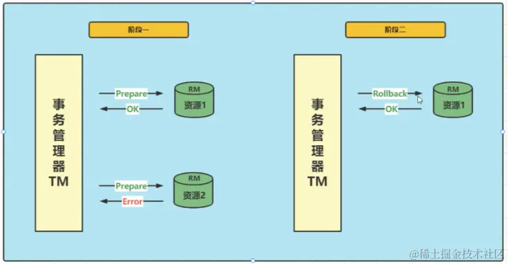- 参与者收到提交请求后,如果之前的准备阶段执行成功,它们会正式提交事务并释放资源。如果有任何一方准备或提交失败,所有参与者将回滚事务(rollback),确保一致性。