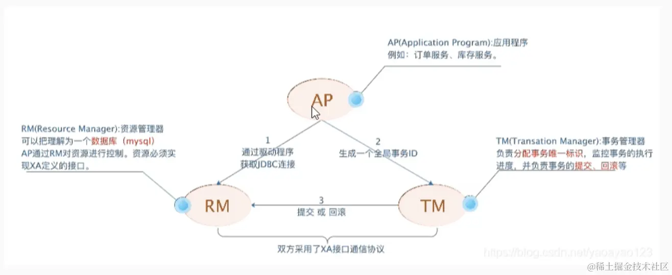 DTP模式定义TM和RM之间的通讯接口的规范叫做XA,简单理解为数据库提供的2PC接口协议,基于数据库的XA协议来实现的2PC又称之为XA方案。