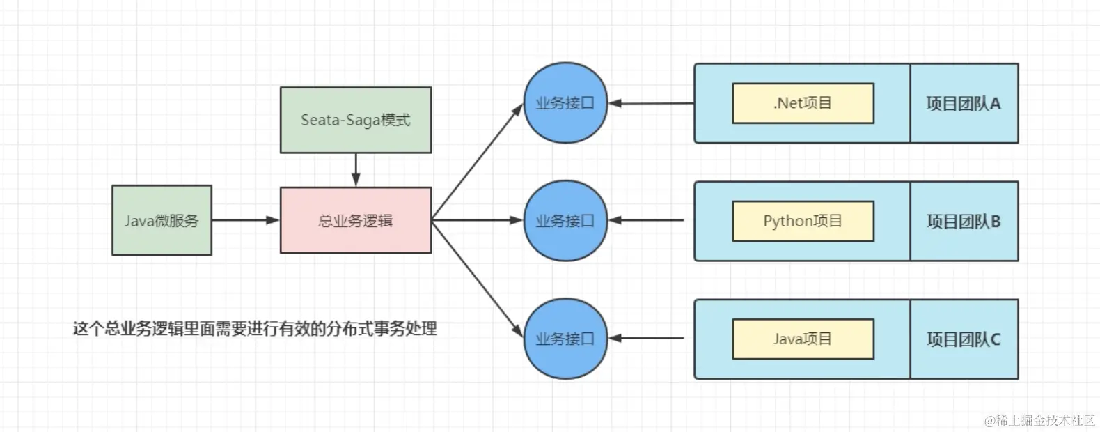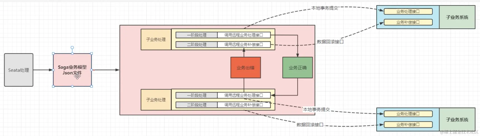 Saga模式是Seata提供的长事务解决方案,提供了异构系统的事务统一模型。在Saga模式中,所有子业务都不在直接参与整体事务的处理(只负责本地事务的处理),而是全部交由最终调用端来负责实现,而在进行总业务逻辑处理时,某一个子业务出现问题的时候,则自动补偿全面已经成功的其它参与者,这样一阶段的正向服务调用和二阶段的服务补偿处理全部由总业务开发实现。