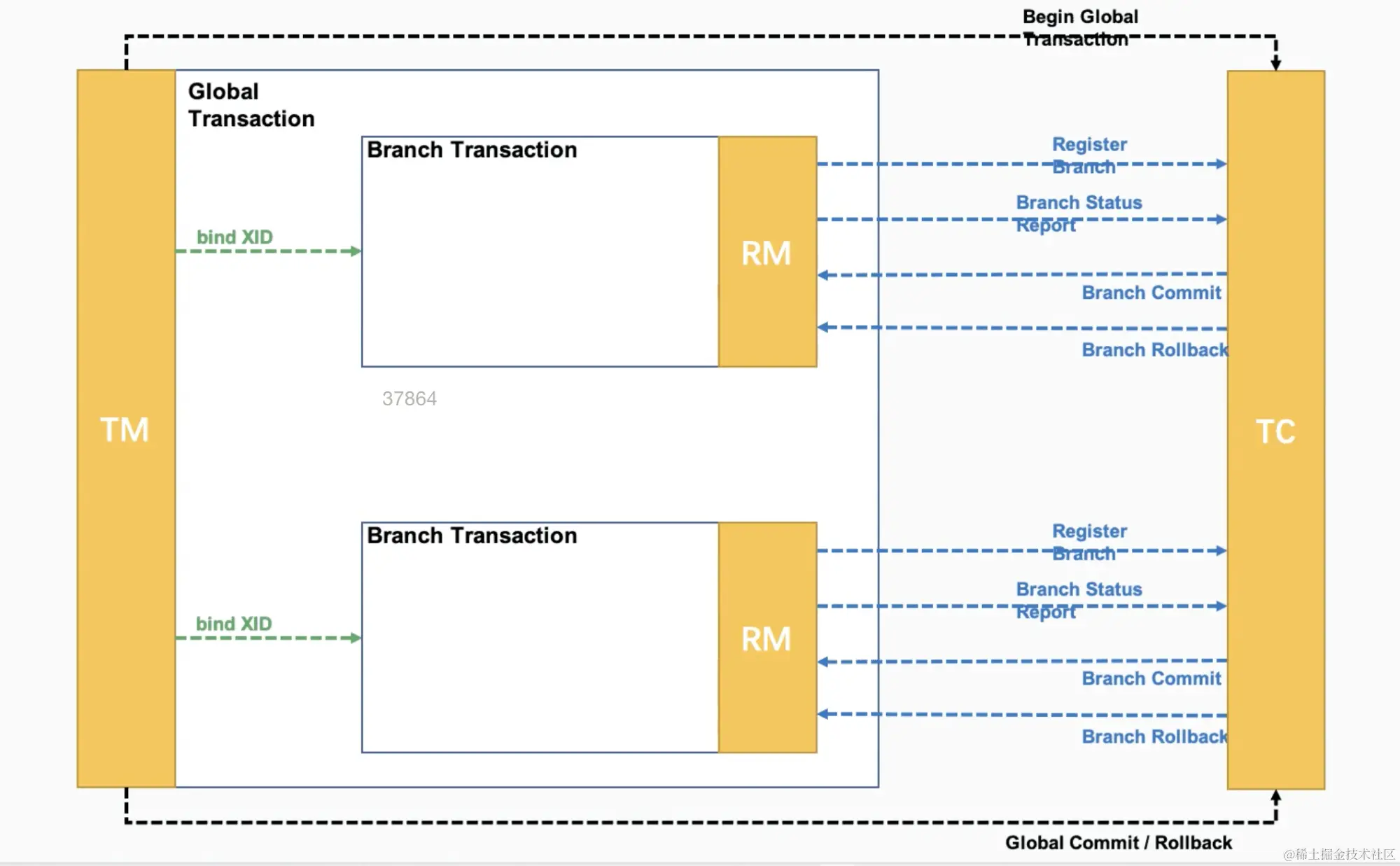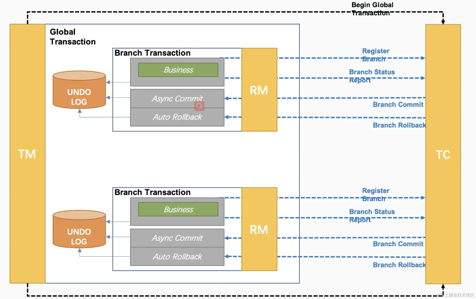 RM(Resource Manager,资源管理器)向TC(Transaction Coordinator,事务协调者)注册,把分支事务关联到XID代表的全局事务当中;
