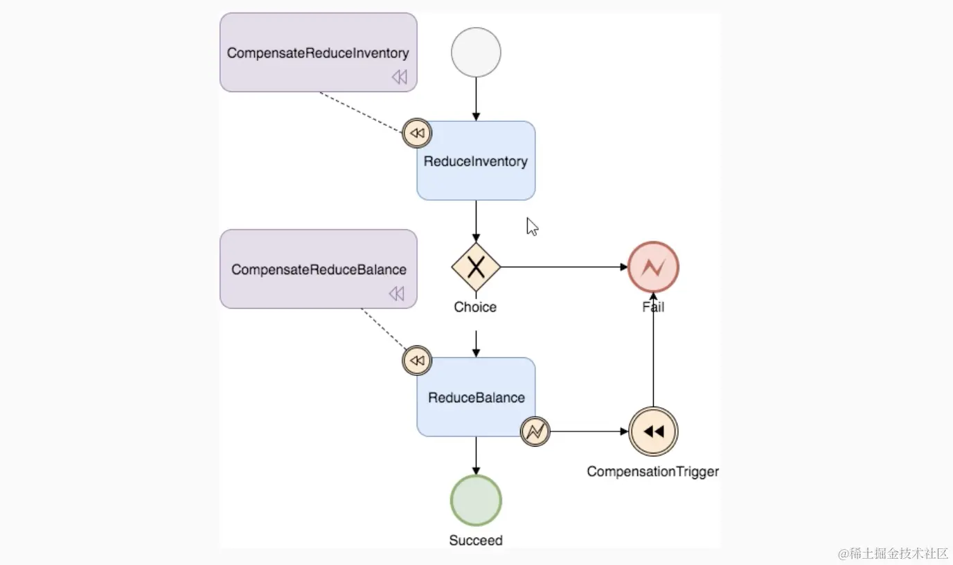 状态图Json由状态机引擎驱动之行,当出现异常时状态引擎反向执行已经成功节点对应的补偿节点,讲其事务进行回滚;