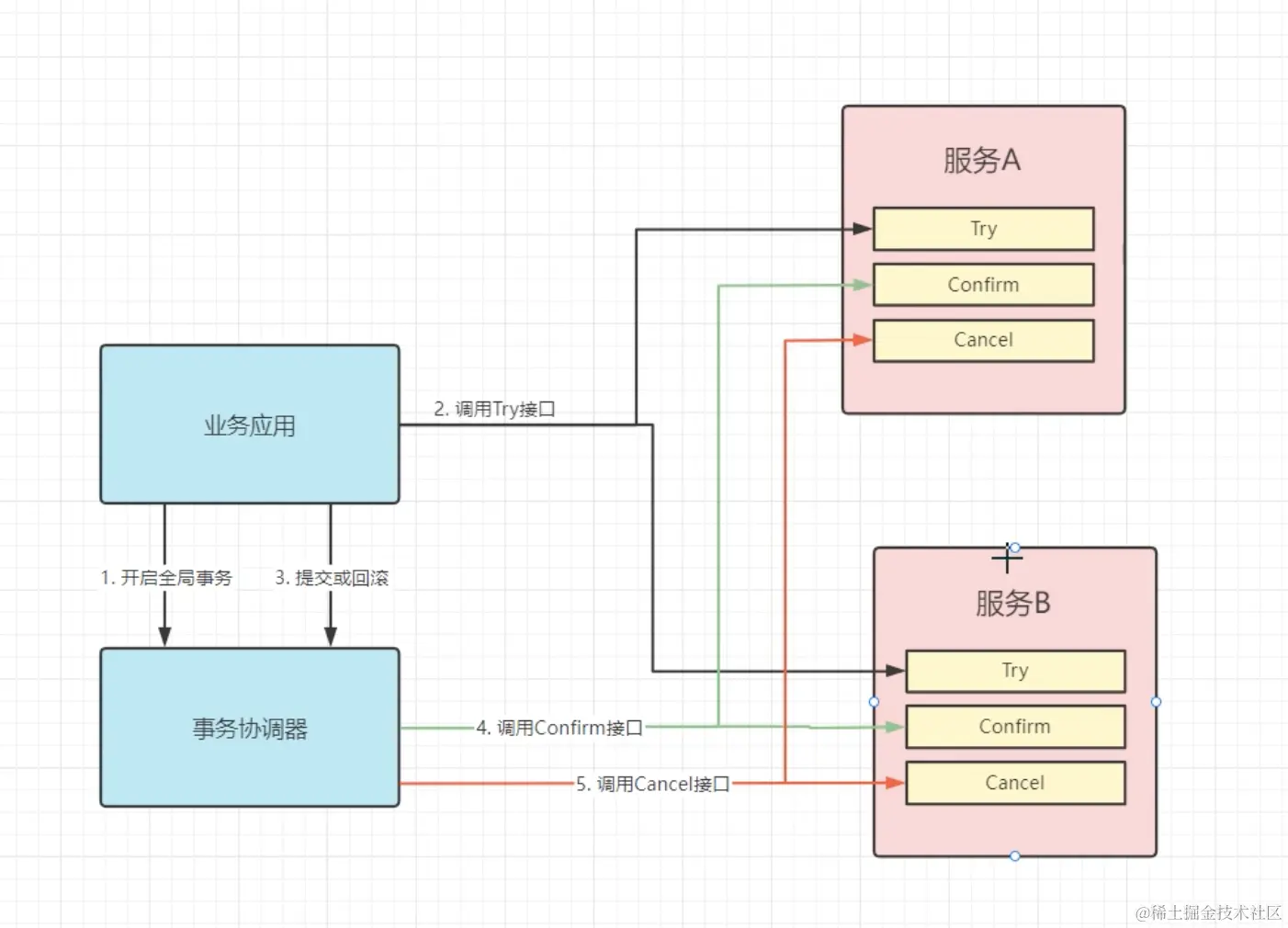 TCC也是分布式事务中的二阶段提交协议,它的全部称为Try-Confirm-Cancel,即资源预留(Try)、确认操作(Confirm)、取消操作(Cancel),具体含义如下: