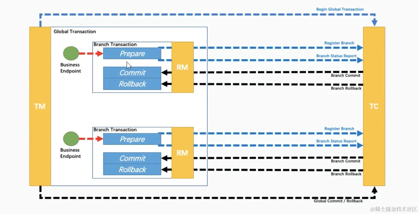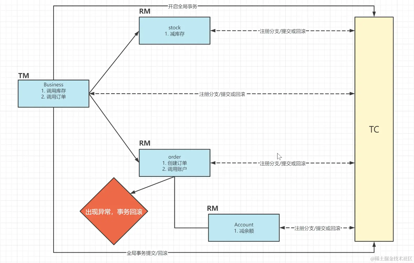 TM(Transaction Manager,事务管理者)向TC请求发起(Begin)、提交(Commit)、回滚(Rollback)全局事务;