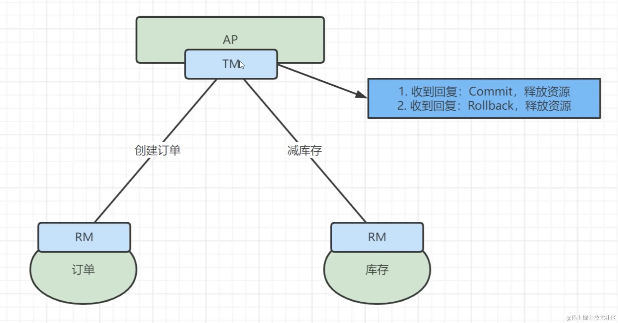 应用程序(AP)通过TM通知订单库RM来创建订单和减库存,RM此时未提交事务,此时,商品和订单资源锁定;