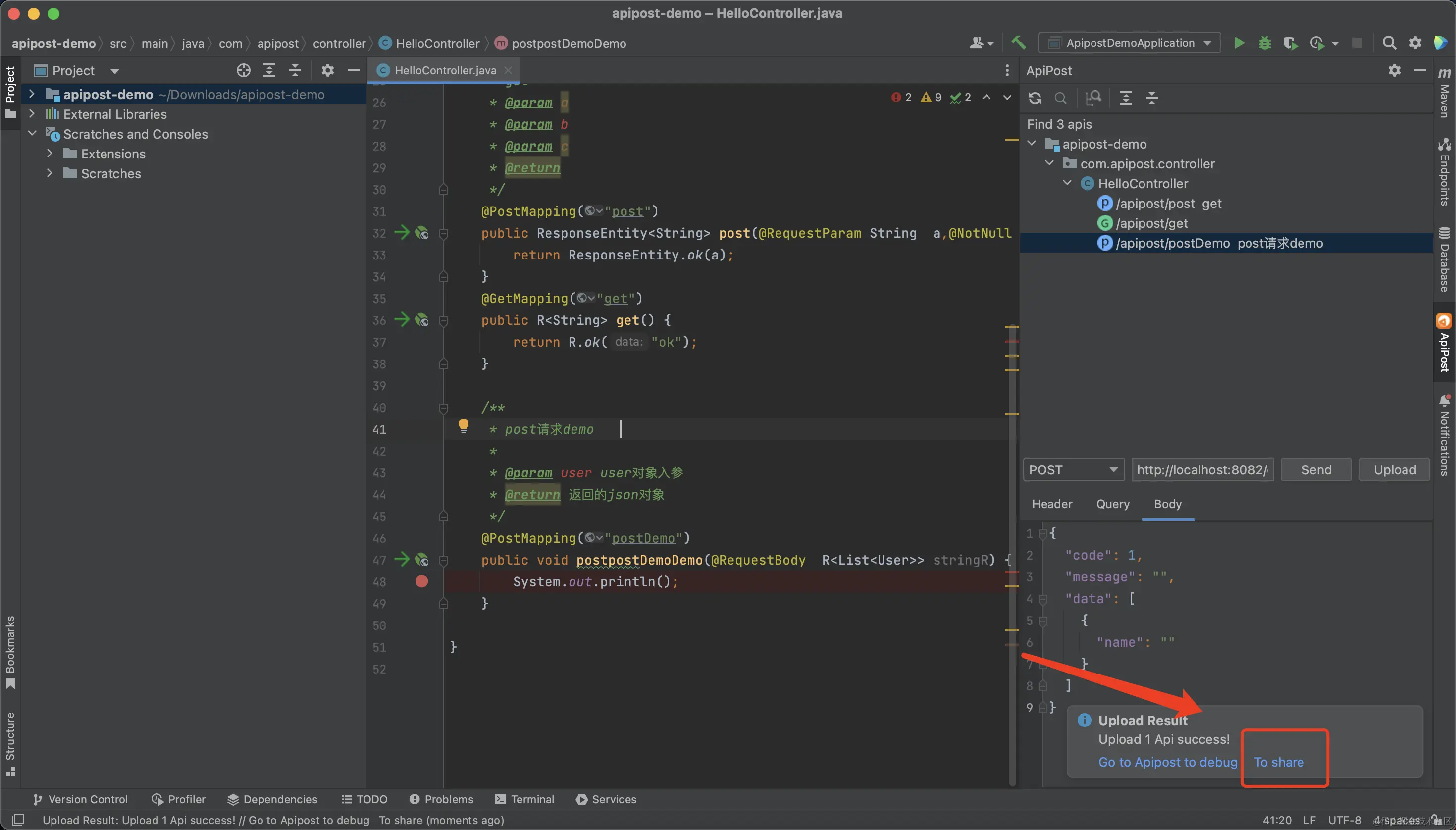 国产API调试工具 Apipost 推出IDEA插件,写完代码就可以调试接口并一键生成接口文档!而且还可以根据已有的方法帮助您快速生成 url 和 params。Apipost Helper = API 调试工具 + API 管理工具 + API 搜索工具。