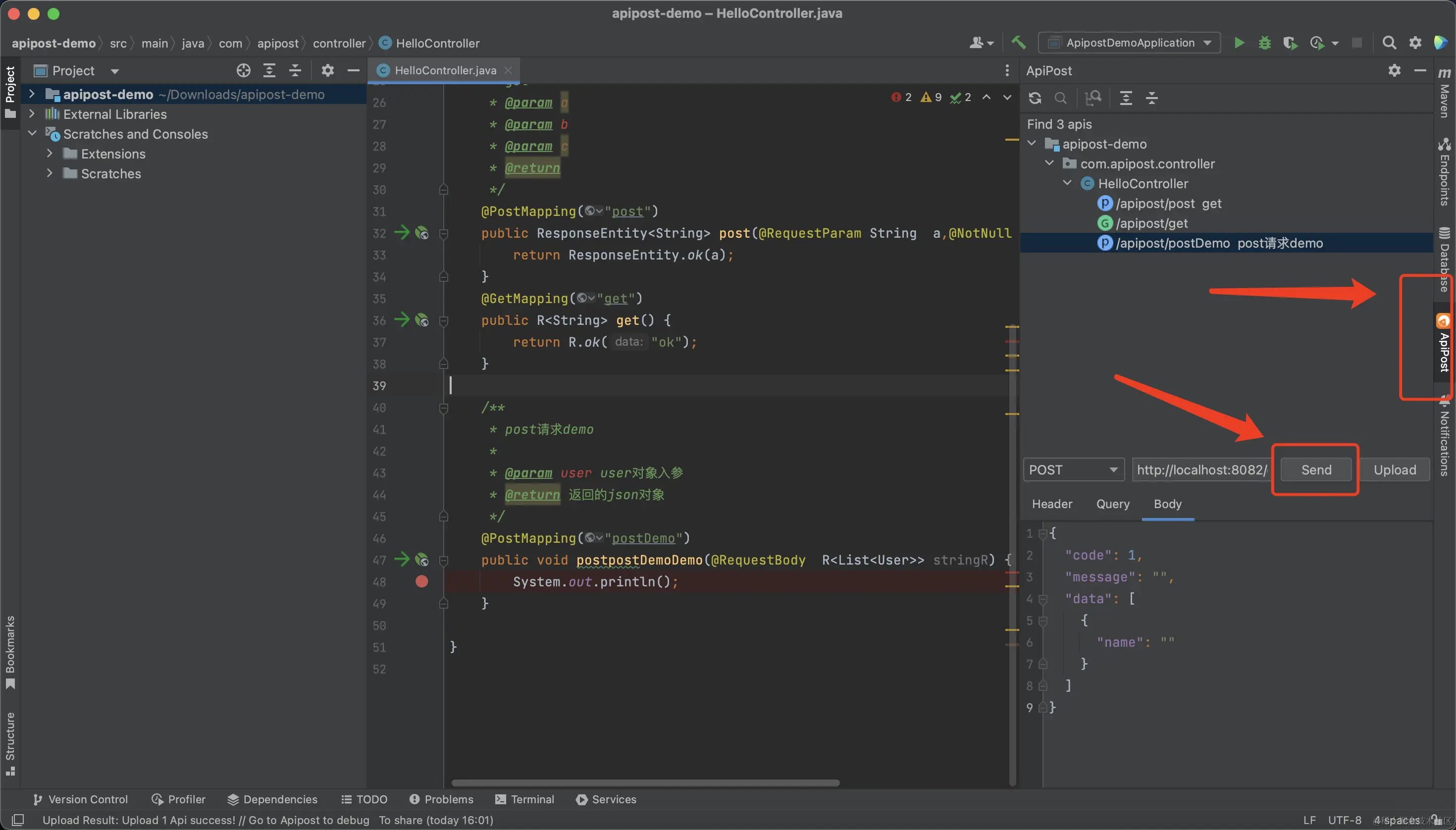 国产API调试工具 Apipost 推出IDEA插件,写完代码就可以调试接口并一键生成接口文档!而且还可以根据已有的方法帮助您快速生成 url 和 params。Apipost Helper = API 调试工具 + API 管理工具 + API 搜索工具。