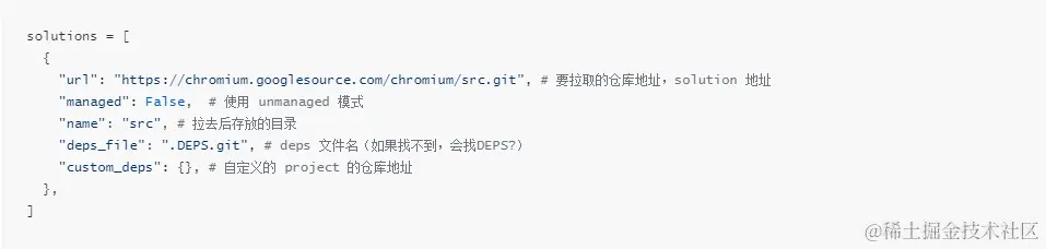该命令用来初始化要拉取的solution,它会在命令执行目录下生成 .gclient 文件; .gclient 文件中记录了要拉取的solution的仓库地址,以及拉取后要保存的位置,如下: