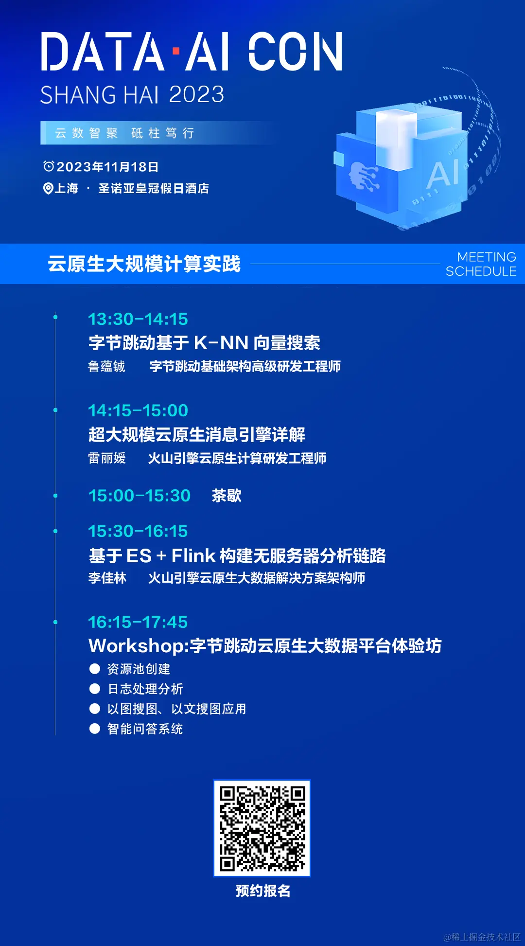 11月18日,在由上海白玉兰开源开放研究院、人工智能开源软件发展联盟联名主办的 Data & AI Con Shanghai 2023 大会上,将特别设立云原生****大规模计算实践专场。来自火山引擎的技术专家们将详细介绍字节跳动在云原生大规模计算方面的实践经验。此外,专场还设立了工作坊环节 , 您将可以亲身体验字节跳动同款云原生大数据平台,更有机会领取海量大礼。