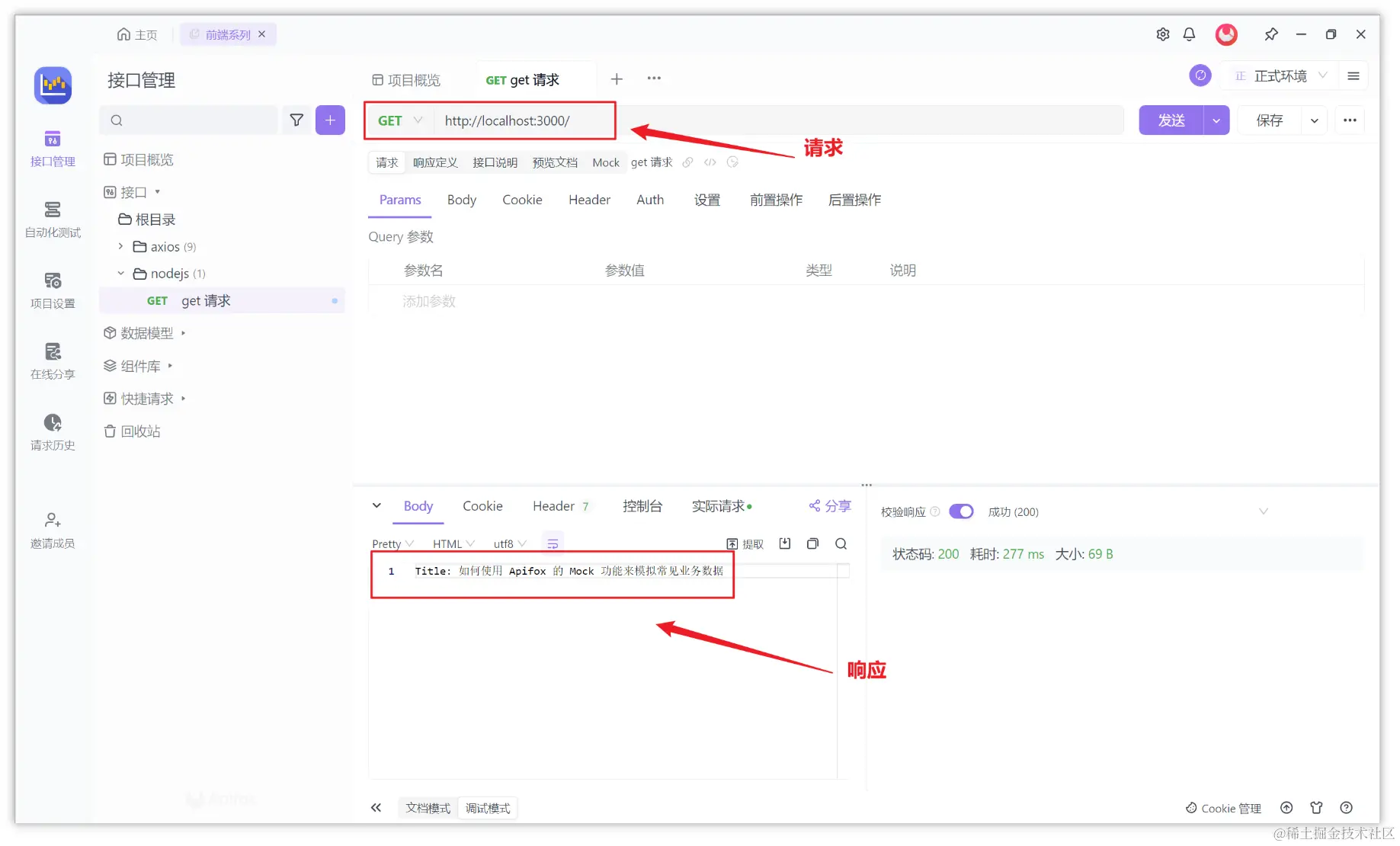 在本文的例子中,就可以通过 Apifox 来测试接口。新建一个项目后,在项目中选择 “调试模式” ,填写请求地址后即可快速发送请求,并获得响应结果,上文的实践案例如图所示: