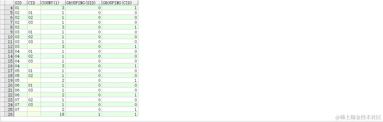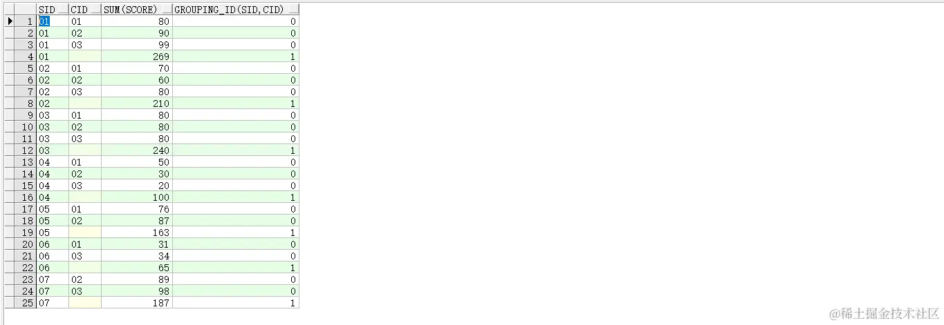 SELECT SID, CID, SUM(SCORE), GROUPING_ID(SID, CID)