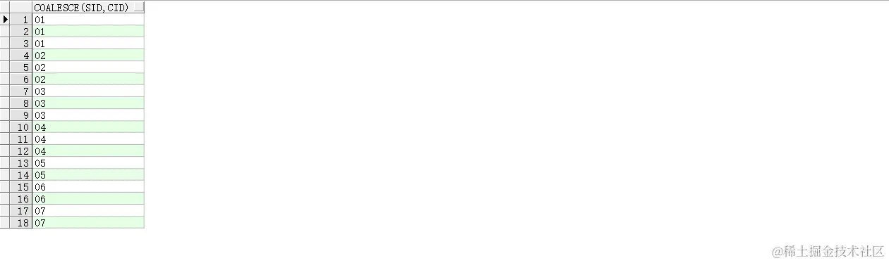 COALESCE(exp1,exp2,exp3,...):依次查找各参数,遇到非NULL则返回,各参数或表达式数据类型必须一致,如果都为null则返回null。