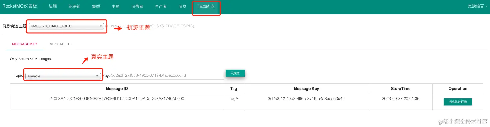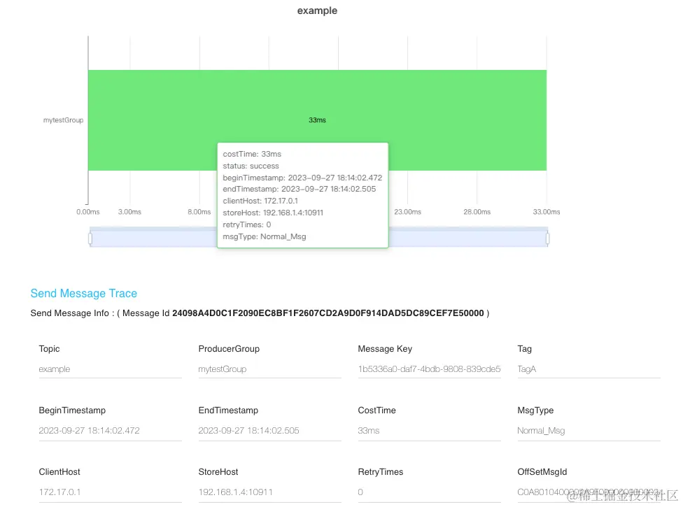 从图中可以看到,消息轨迹中存储了消息的存储时间 、存储服务器IP 、发送耗时 。