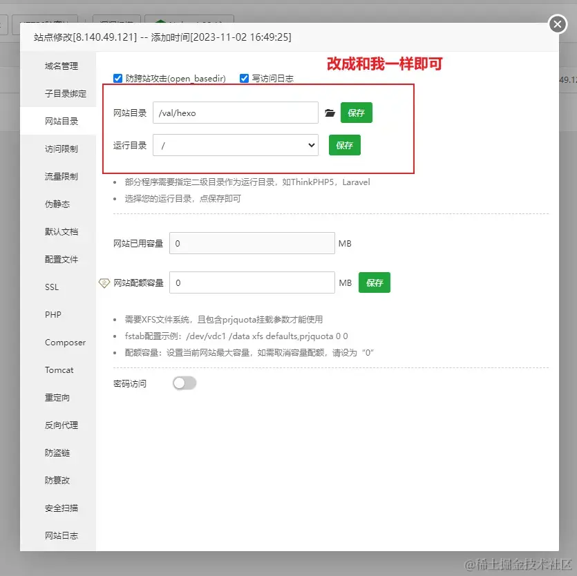 提交完成之后找到网站设置,点击配置文件(修改server_name和root这两个地方即可)改完之后点击保存