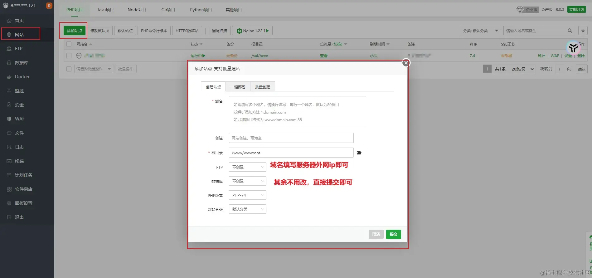 安装之后,按照下图操作(点击左侧网站菜单,选择PHP项目添加站点,域名输入服务器公网ip,其余不管点击提交)