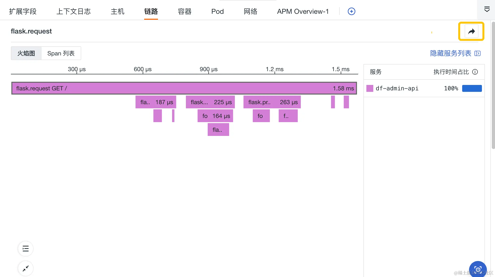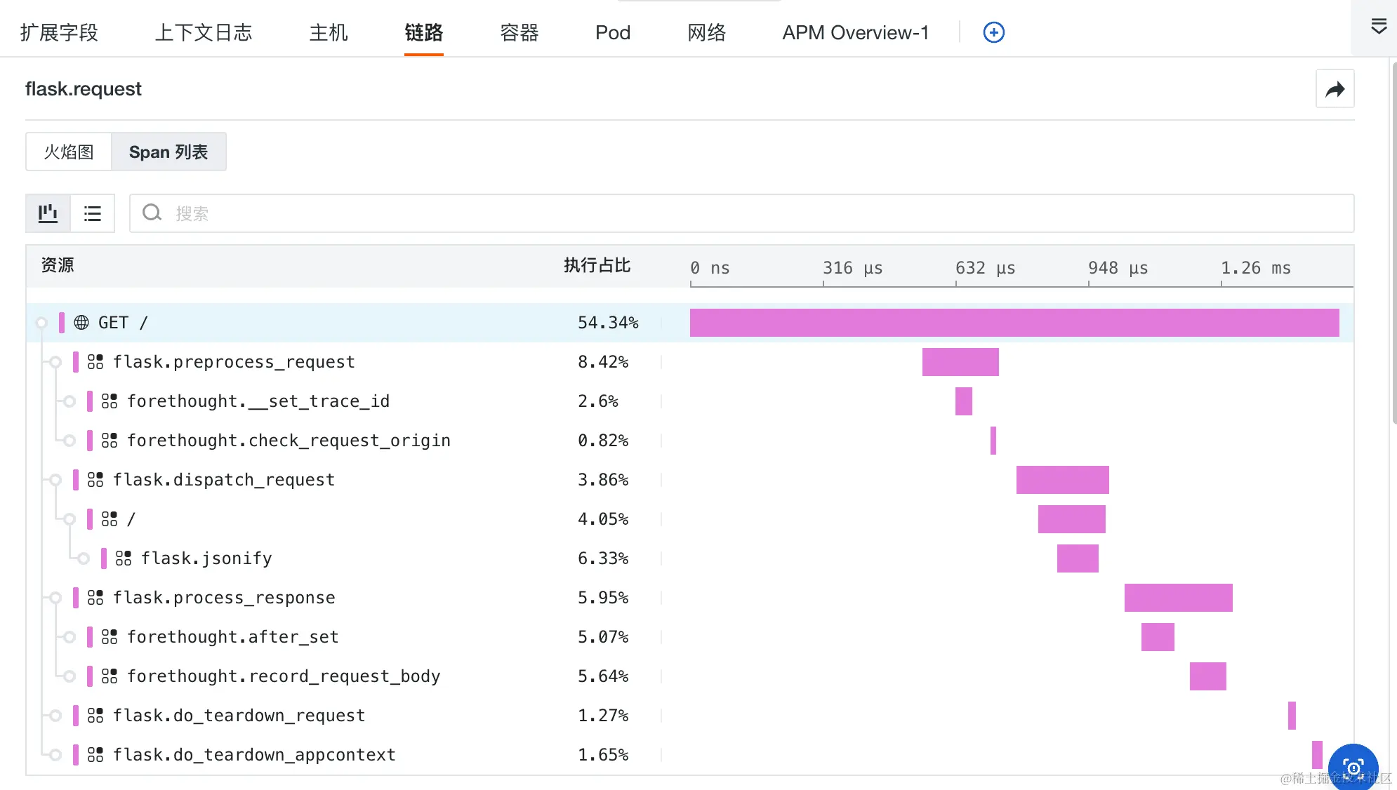 如下图所示,您可以在日志详情页的链路中查看当前日志相关的链路的火焰图和 Span 列表,追踪完整的链路信息,快速查看链路中每个Span的情况,定位错误及其原因。同样,点击右上角的按钮即可直接跳转至对应的链路详情页,支持进行更多维度的数据分析。