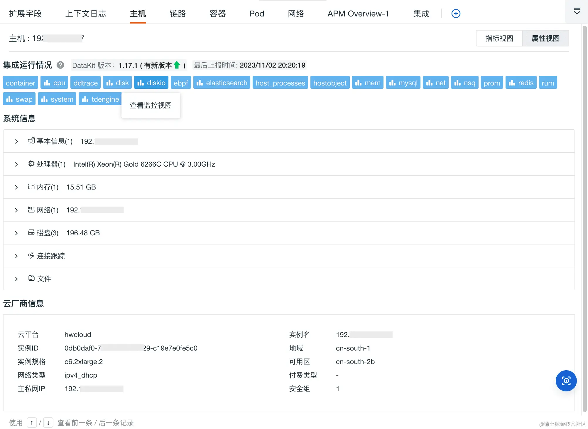 属性视图则能够帮助您回溯日志产生时主机/容器/Pod 对象的真实情况,支持查看相关主机/容器/Pod 在对应时间内产生的最新一条对象数据,包括其基本信息、属性信息等。特别的,主机属性视图还会显示集成运行情况以及云厂商的信息。您还可以点击集成直接进入监控视图查看更详细的数据情况。