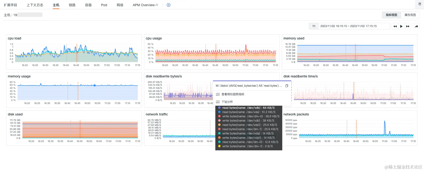 通过指标视图,您不仅能够查看相关主机/容器/Pod 的 CPU、内存等性能指标状态,还可以针对某一数据点进行下钻分析、根因分析或查看相似趋势指标,帮助您得到更加精准的数据分析结果。