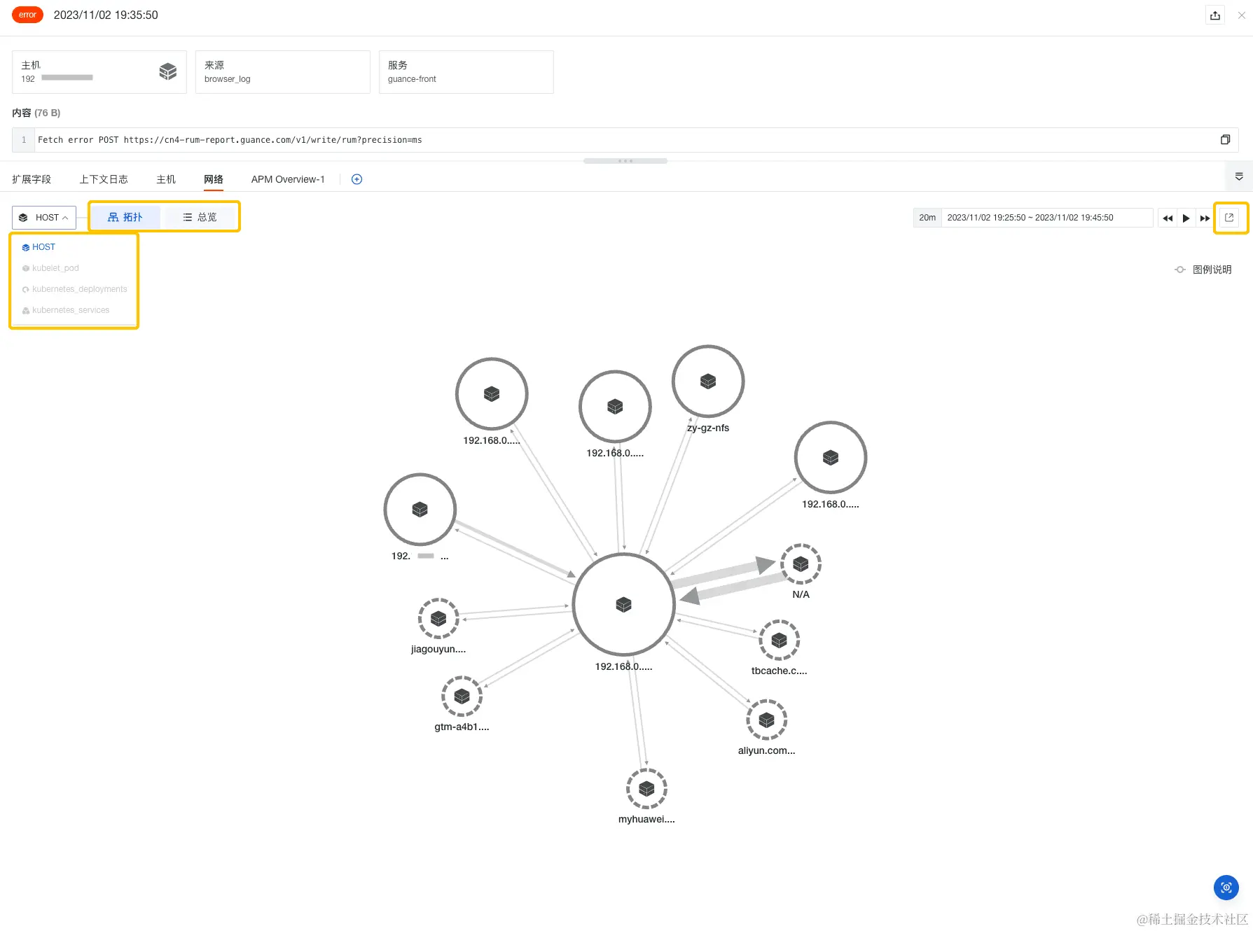 当需要确定系统网络是否出现故障以及故障位置时,您可以通过日志详情页中的网络界面看到网络的拓扑图和总览。
