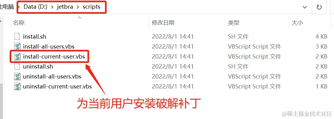 点击进入 /jetbra 补丁目录,再点击进入 /scripts 文件夹,双击执行 install-current-user.vbs 破解脚本: