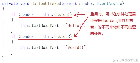 手机的关注者被通知之后,会去检查事件参数,之后根据参数内容采取相应的行动,比如接电话、回微信、或者可能直接忽略消息给手机关机 —— 这种根据通知和事件参数采取行动的行为称为响应事件,关注者在响应事件时具体所作的事情叫做 事件处理器 EventHandler。