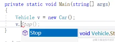 代码变得整洁了,但是出现了一个新的问题——当在主函数中用 Vehicle 来声明一个Car的对象,这个对象只能调用Stop,不能调用Run(因为Run方法是在子类中各自新增的)