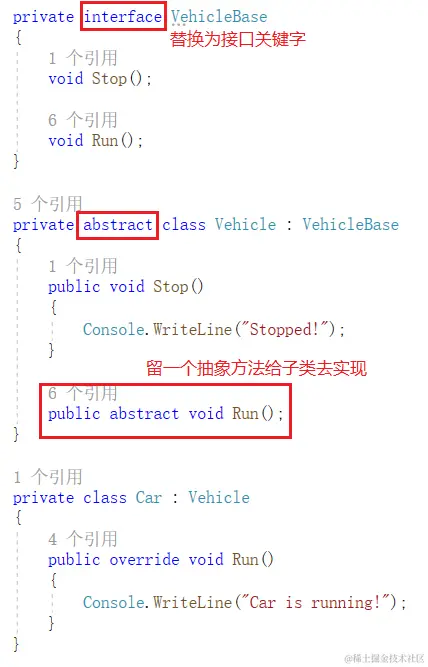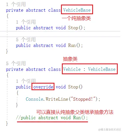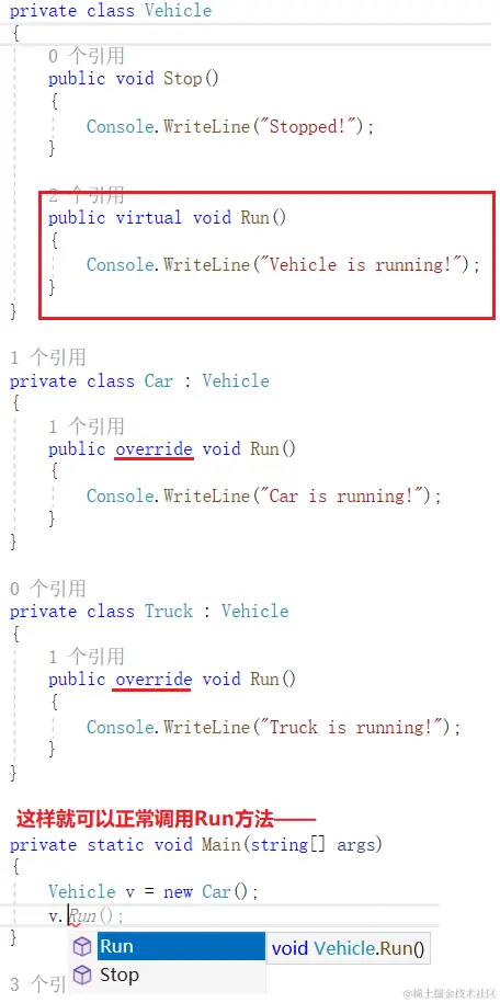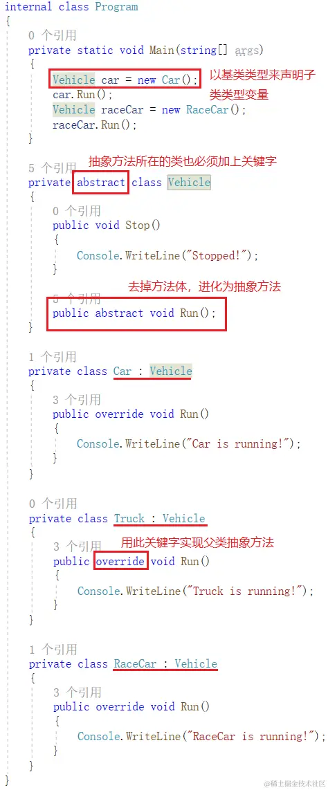 这样看来,方法体的存在就毫无意义 —— 因此更进一步,我们直接去掉Vehicle.Run的方法体——这时Run就变成了纯虚方法 —— 也就是抽象方法。
