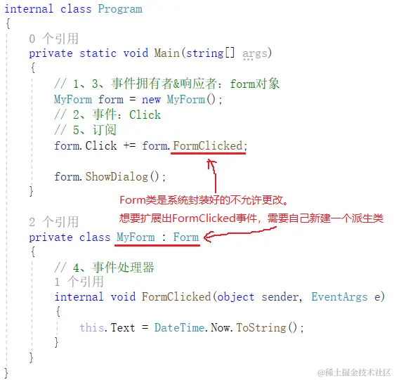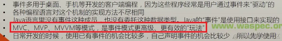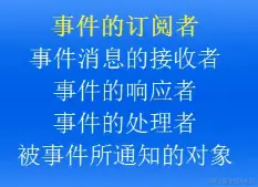 —— 作为类/对象的成员,事件、属性、方法等各自具备自己的功能,而<事件>的功能不在于事件本身,而是在于在事件发生时通知订阅者的能力。