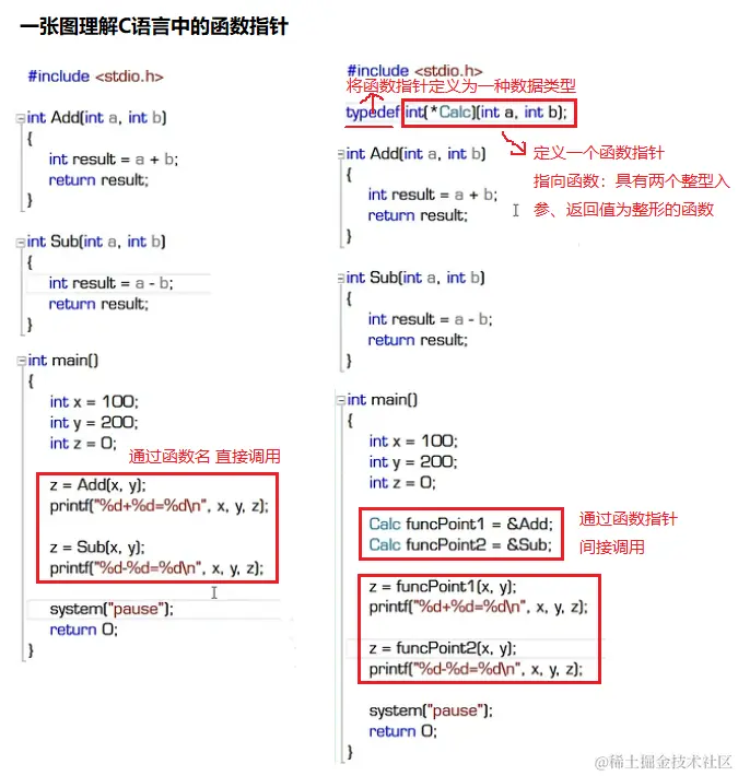 - 间接调用:通过函数指针调用函数。CPU通过读取函数指针存储的值,获得函数所在地址,执行——》返回