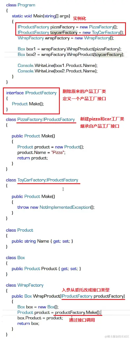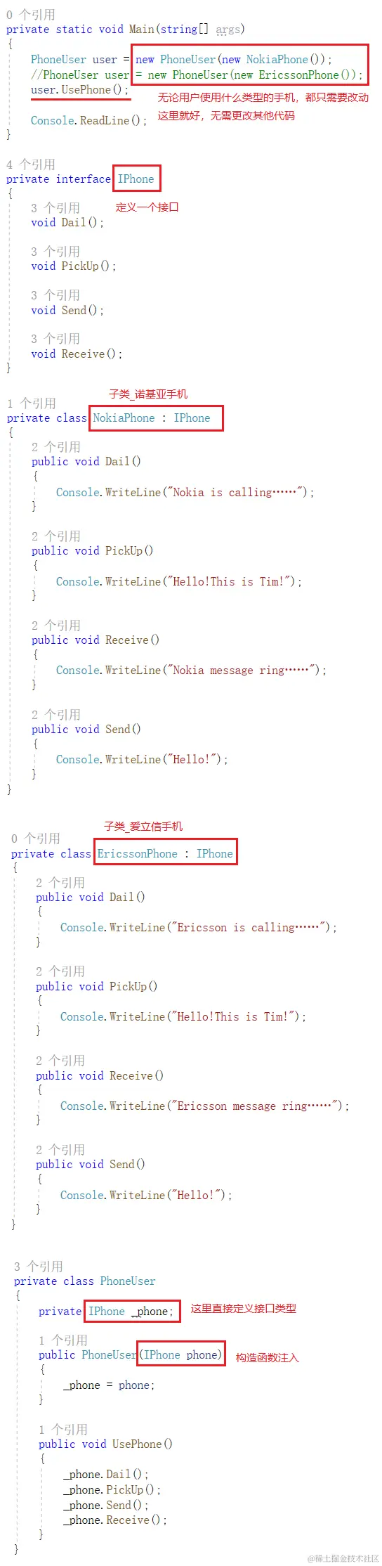引入接口之后,类扩展时只需要在主函数中声明即可,不用动其它部分的代码 —— 成功解耦,变成松耦合。