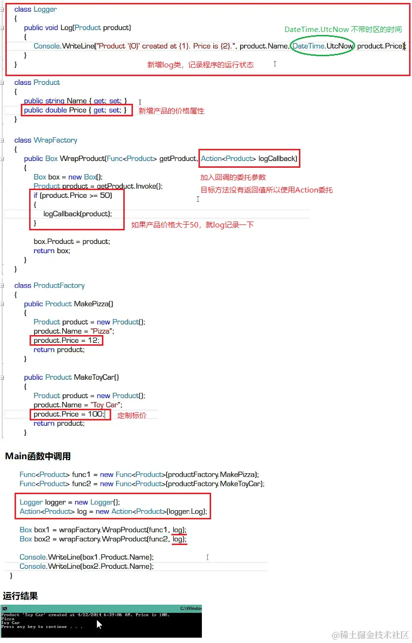 好处: 假设方法B包含一个委托参数,委托封装了另一方法A。在B的方法体内,可以通过使用委托,动态调用方法A,从而形成一种动态调用方法的代码结构。