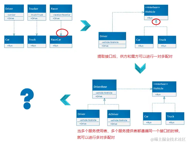 体现如下图 —— 原本向下依赖的箭头 变为 向上依赖的箭头,这就是依赖倒置的名字由来。